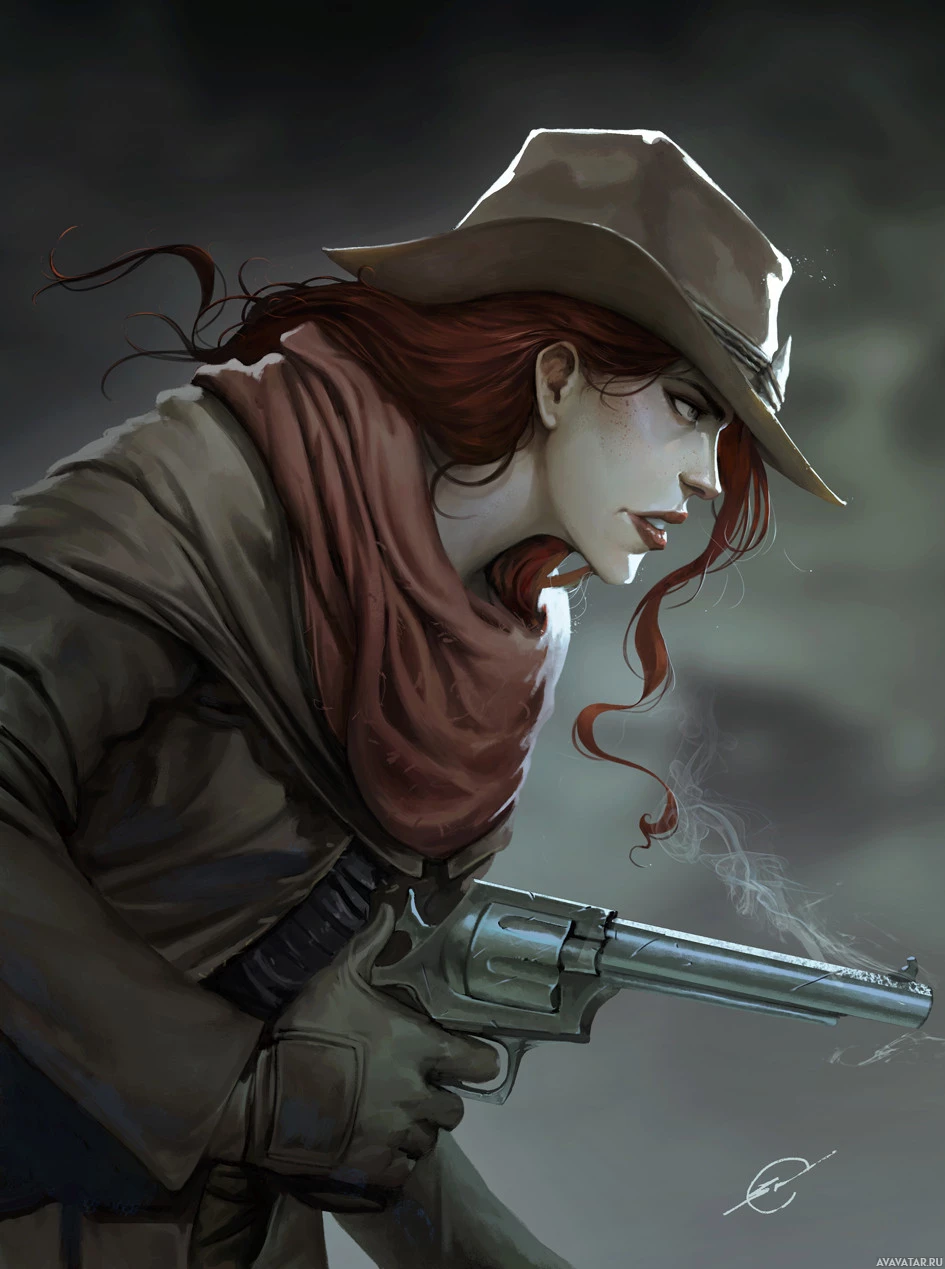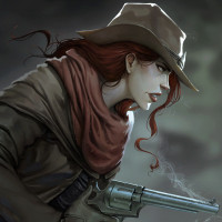 a cowboy hat and holding a pistol. She appears to be in a setting that suggests an old Western or