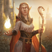 a female character dressed in fantasy-style attire that resembles an elf. She is standing on what appears to be a bridge or archway with a castle-like