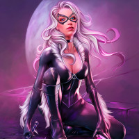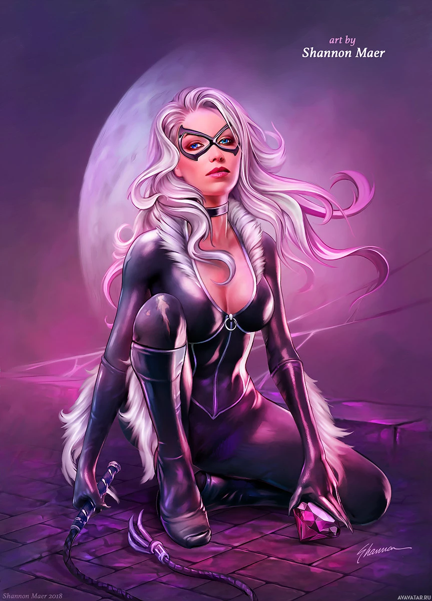 The image shows a character wearing a black and purple costume with cat-like features, such as ears and a tail. She is depicted in