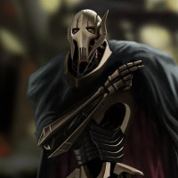 Star Wars" franchise. He is standing in what appears to be a ruined or damaged setting, possibly indicating he has been involved in some