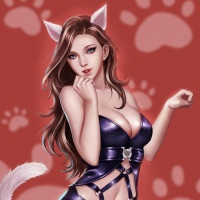 purple bodysuit or swimwear and has prominent feline features such as ears, which are part of her attire rather than a natural physical trait. Her pose suggests she may be a character from an animated series or video game designed for