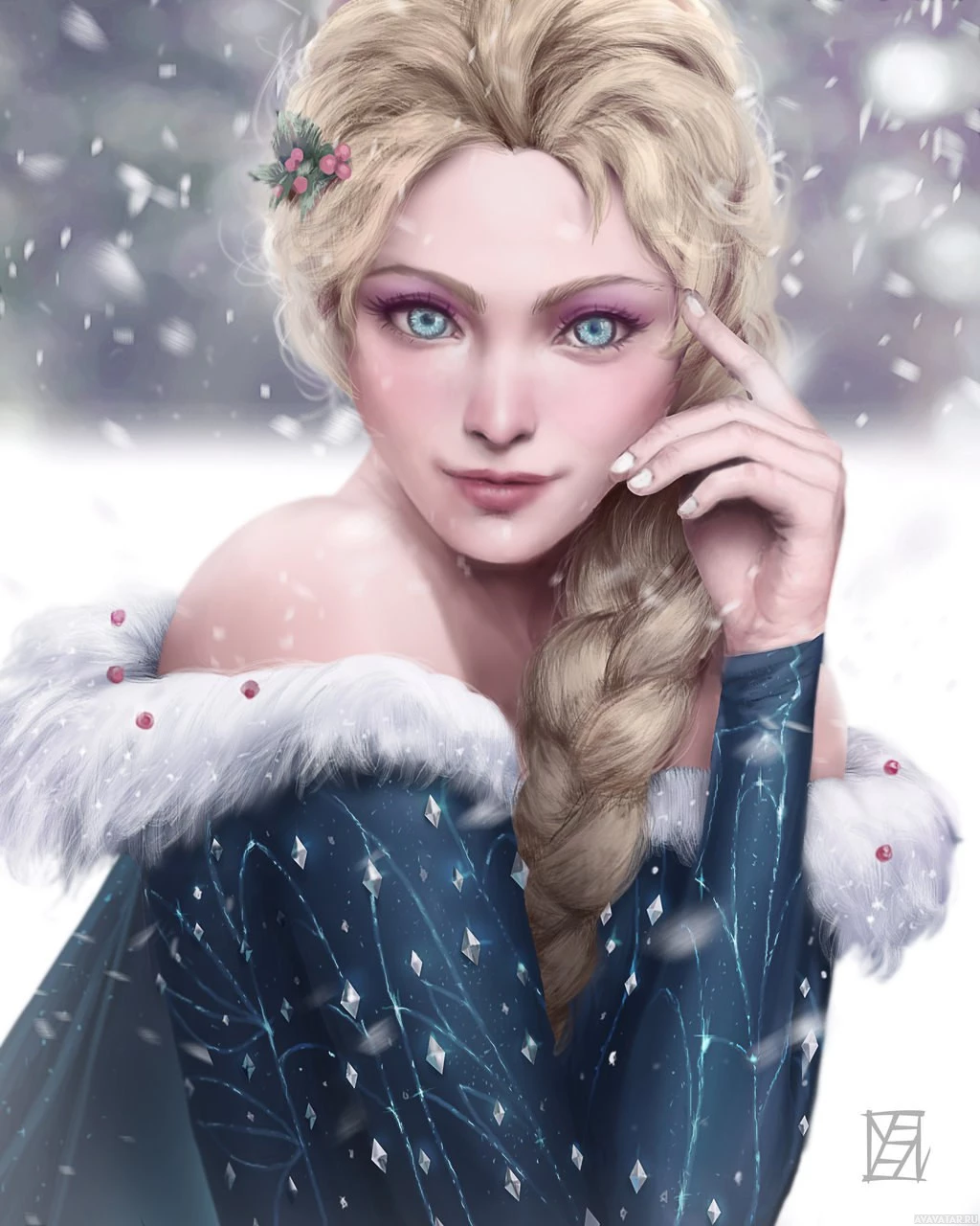 braided hair, wearing a snow-themed outfit that includes fur around her collar and wrists. Snowflakes are falling around her, suggesting