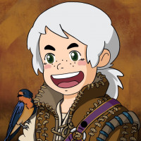 The image shows an animated character who appears to be Ciri from "The Witcher 3: Wild Hunt" video game. She is depicted with a big smile, holding a book and a bird perched on her shoulder. She is dressed in armor with detailed designs, suggesting she might be in the middle of an adventure or a quest within the game's universe.