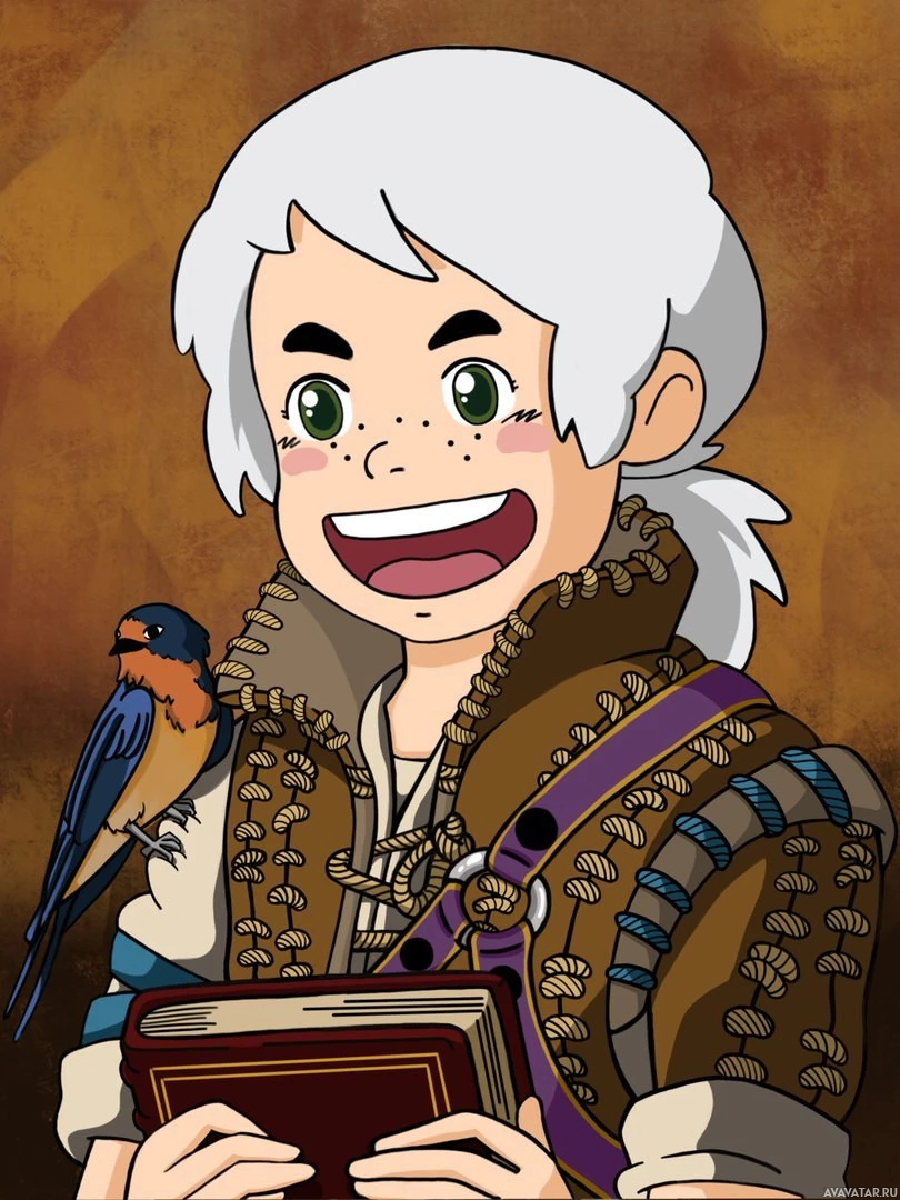 На картинке изображен анимированный персонаж, который, похоже, является Чири из видеоигры «Ведьмак 3: Дикая Охота». Она изображена с большой улыбкой, держа на плече книгу и птицу. Она одета в доспехи с подробным дизайном, предполагая, что она может быть в середине приключения или квеста во вселенной игры.