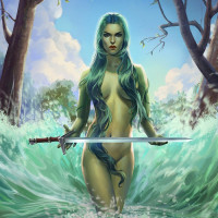 На данной картинке изображена женщина, стоящая в воде, держащая меч. У нее зеленые волосы и, похоже, она носит доспехи или кожу с юбкой. Стиль работы предполагает, что это может быть из видеоигры «Ведьмак»