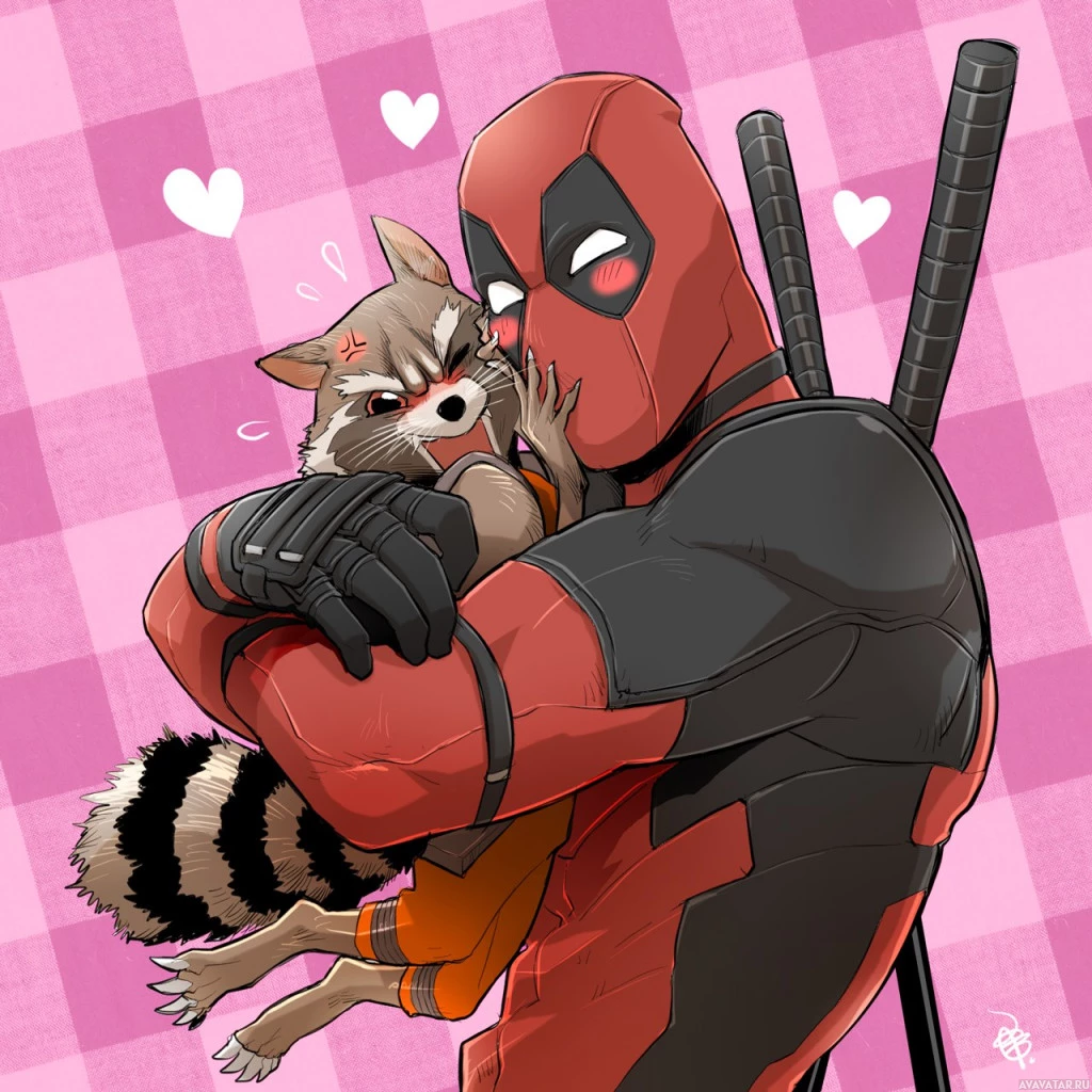 a fictional character from comic books, hugging Rocket Raccoon, another well-known character from Marvel Comics. They are set against a pink and white checkered background with hearts in the corners, suggesting that this is an illustration or