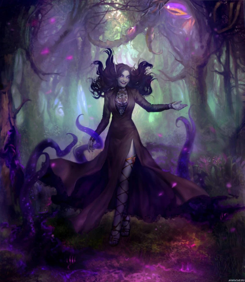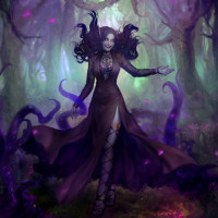 an enchanted forest setting with purple moss and other mystical elements, suggesting a magical or otherworldly environment typical of fantasy genres.