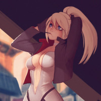 The image shows an animated character, a girl with blonde hair. She is depicted in a dynamic pose, as if she's either moving or dancing. She is dressed in what appears to be some kind of outfit that could suggest she might have a role related to adventure or combat. The background suggests an urban setting at night.