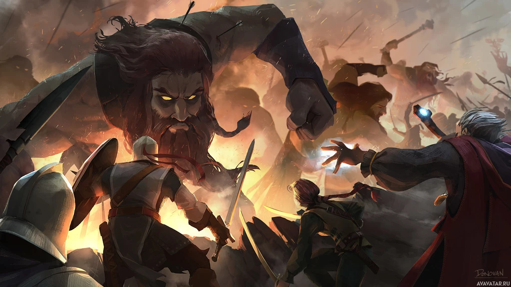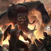 menacing figure that appears to be a giant warrior with an expression of intense focus or anger. This figure is holding a weapon, ready for battle. Surrounding this