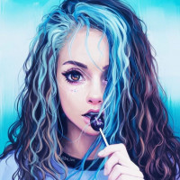 blue tones, which complements the color scheme of her hair and makeup. The style of the image is reminiscent of