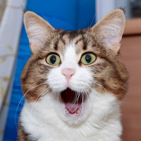 open eyes and mouth. The cat appears to be in mid-yawn, which might contribute to