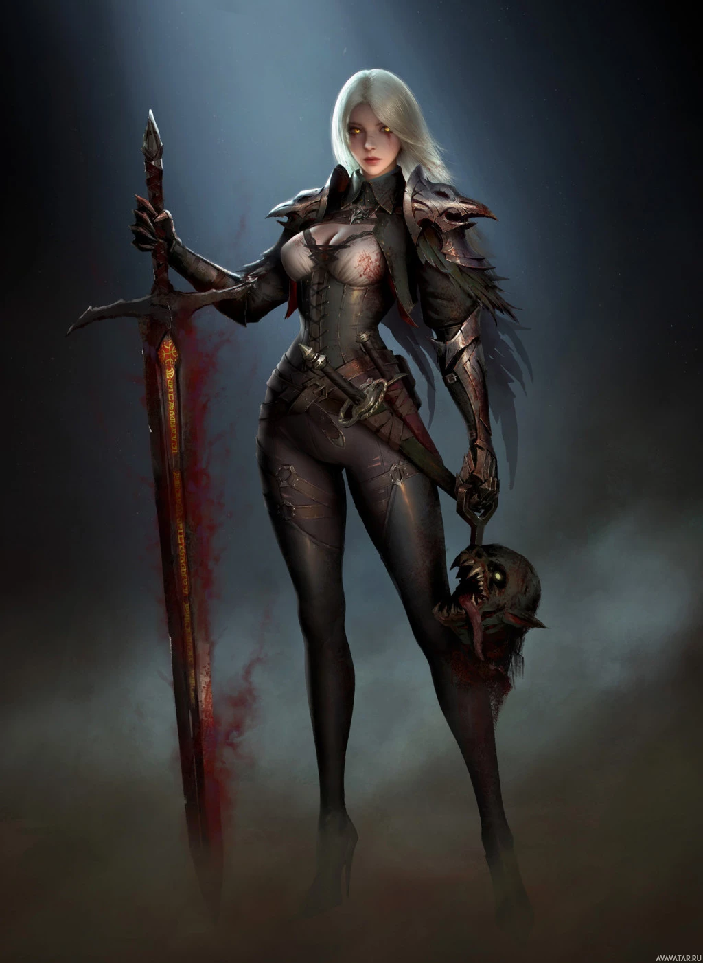 gritty atmosphere around her, enhanced by what appears to be blood splattered on her armor and the ground, suggesting she may have recently engaged in combat or a battle. The artwork is highly detailed and evokes