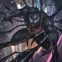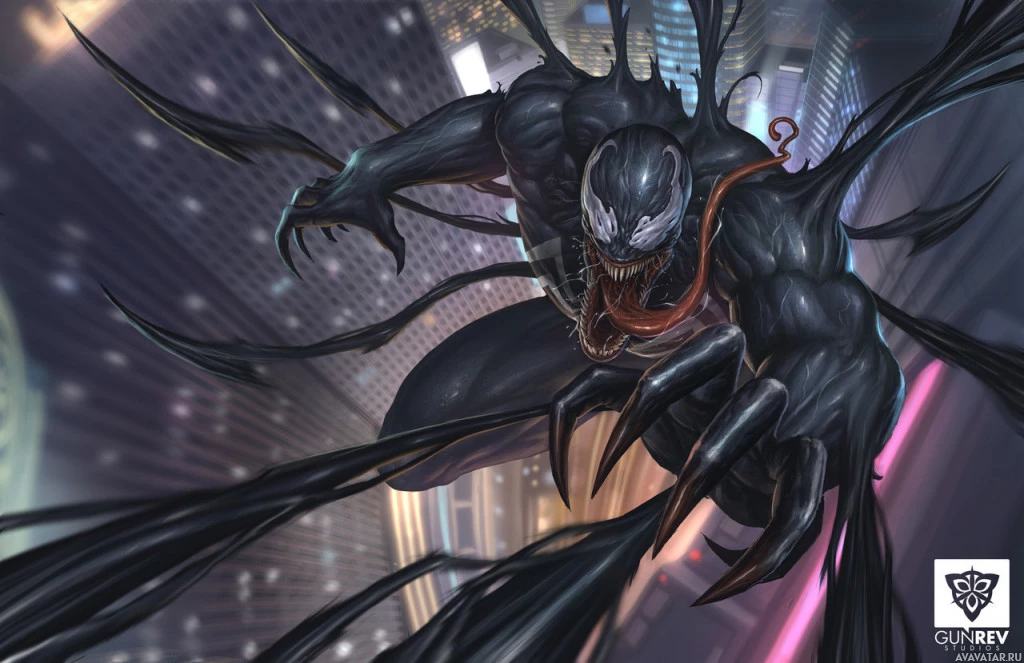 comic book and movie villain. The character is depicted with black symbiotic suit, white eyes,