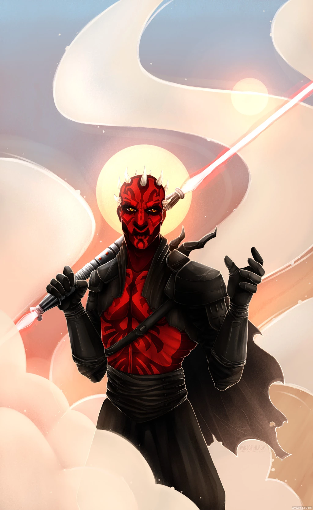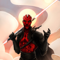 a red lightsaber, and there are various elements in the background such as clouds, stars, and what appears to be a planet or moon with two suns, which gives a sense of a dramatic or adventurous setting consistent with the Star Wars universe. The art style suggests it could be related to
