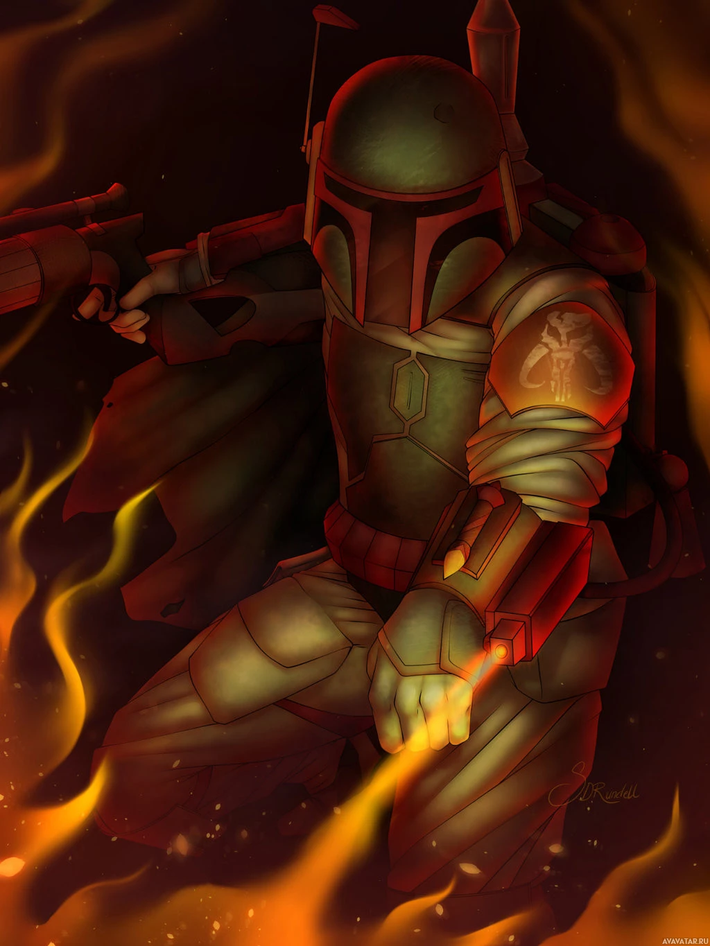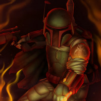 the iconic armor and helmet associated with the role. The character is holding what seems to be a weapon, suggesting they are in a combat or action scenario. The background includes flames, which adds