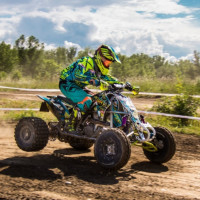 a dirt track. The ATV has large off-road tires, and the rider is wearing