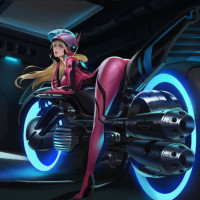 a video game or animated series, depicted as a futuristic blonde girl riding a motorcycle. She is wearing a pink and black outfit, which seems to be futuristic-themed attire, with elements that suggest