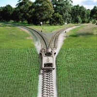 lush greenery typical of a rural or forested area. There's also a small section of what appears to be crops on either side of the tracks at the bottom of the image. It looks like a digital manipulation where