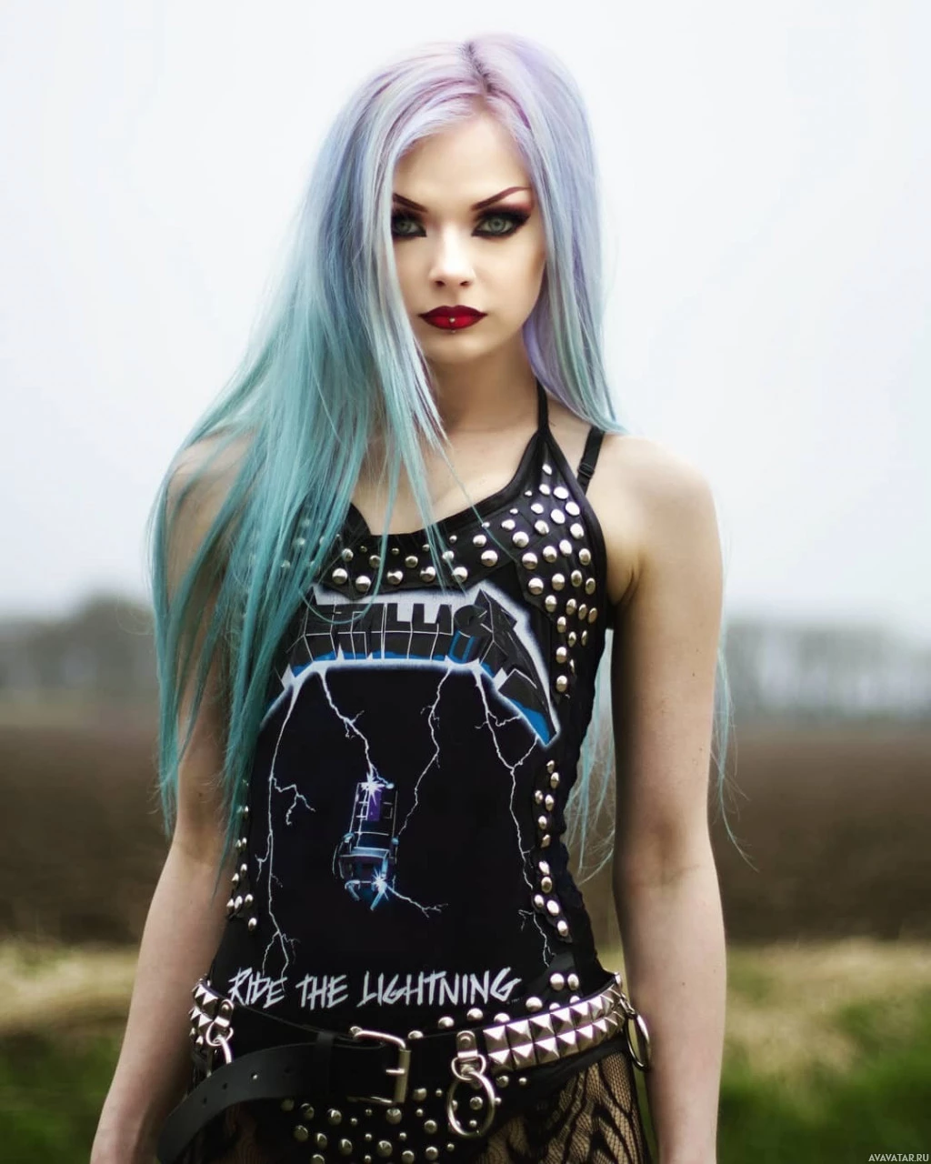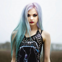 blue hair and dark makeup, wearing a tight black tank top. They appear to be outdoors, possibly in a field or park, as there's