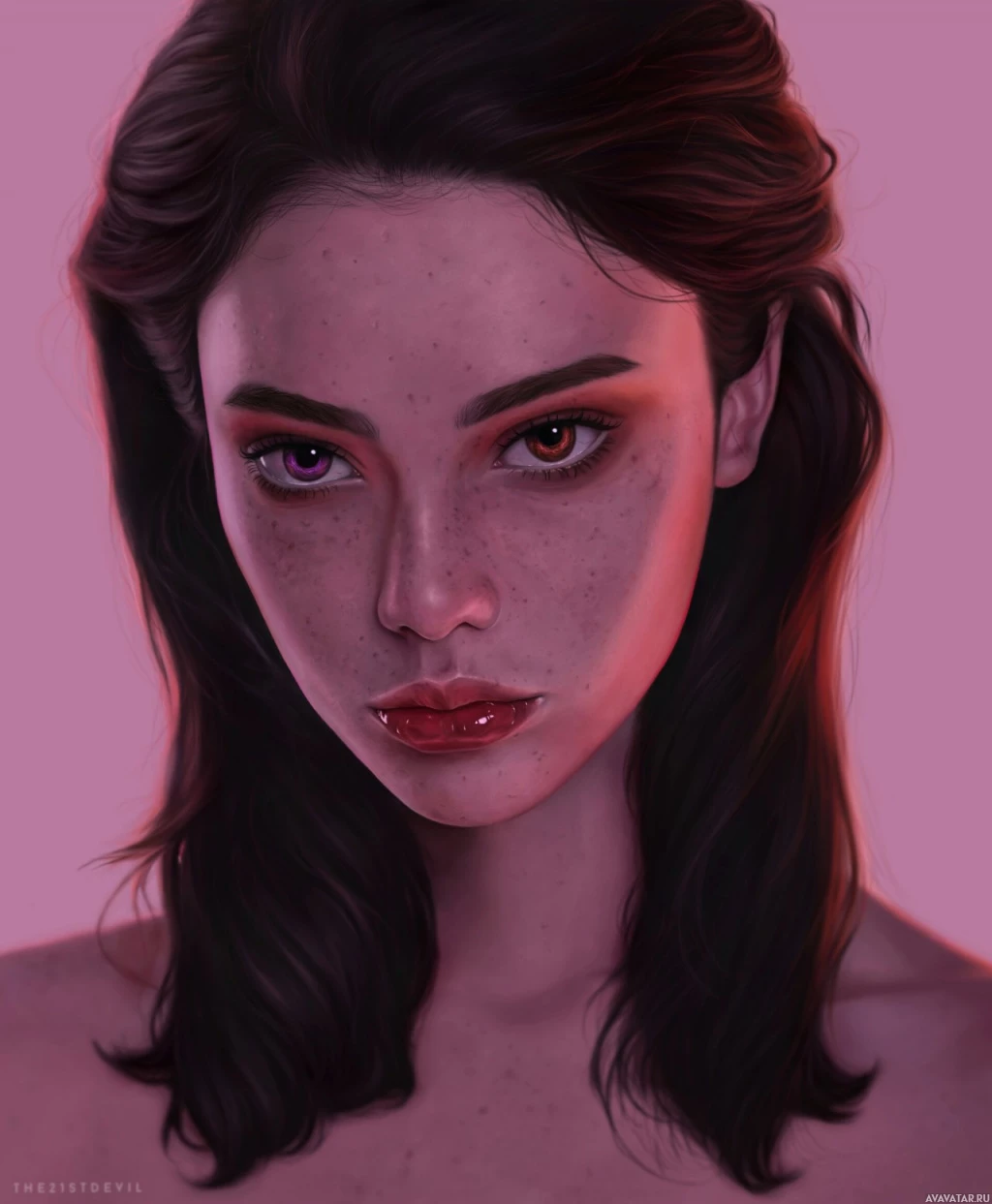 fair skin and is depicted with noticeable freckles across her face, which adds to the realistic rendering of the character. Her hair is styled in loose waves, and she has