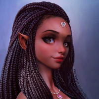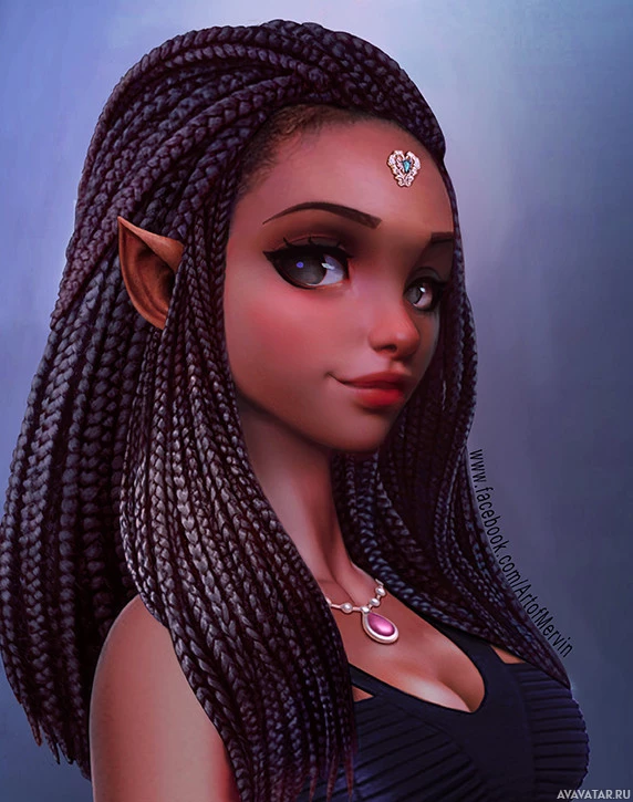 the fantasy genre, such as dark skin, large eyes, and what seems like an enchanted expression. She is wearing a dress and jewelry that add to her mystical appearance.
