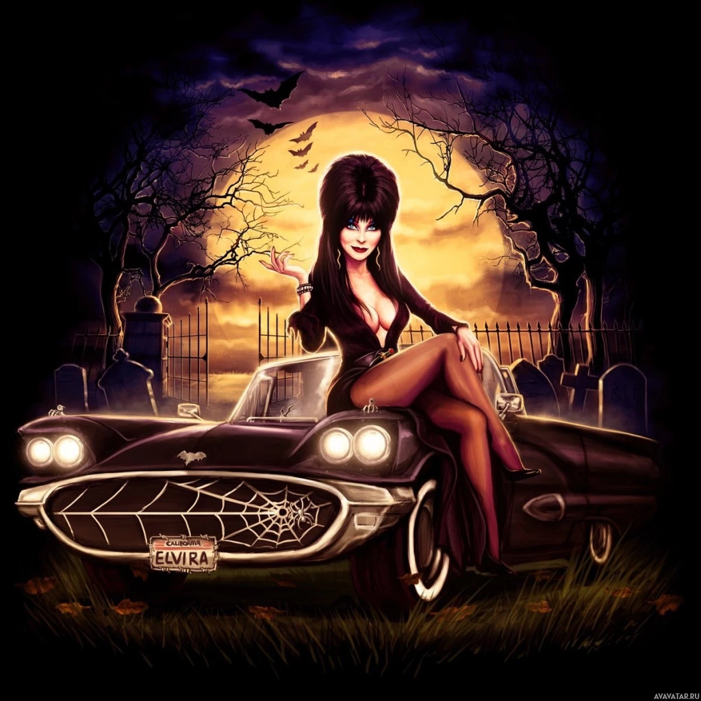a classic car, which is set against a Halloween-themed backdrop. The woman appears to be wearing vampire makeup and has a gothic or witchy style with
