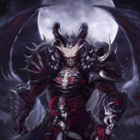 a demonic figure prominently displayed. This figure has a menacing appearance with horns and pointed ears, typical of demons in