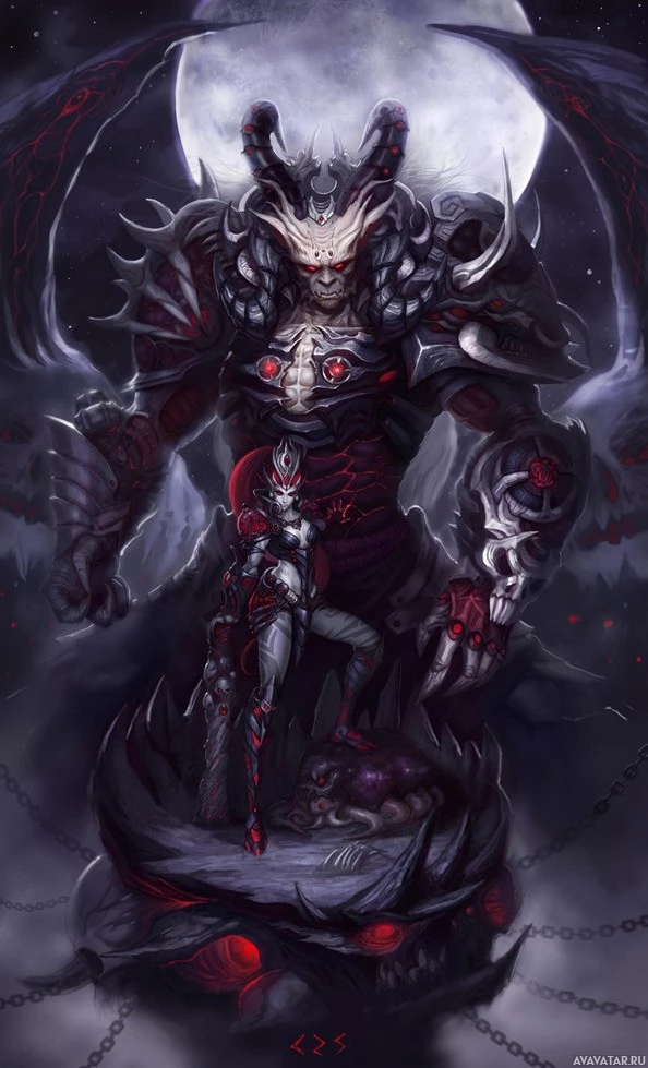 fantasy literature and media. The demon is standing on what appears to be an altar or sacrificial platform, with a dark,