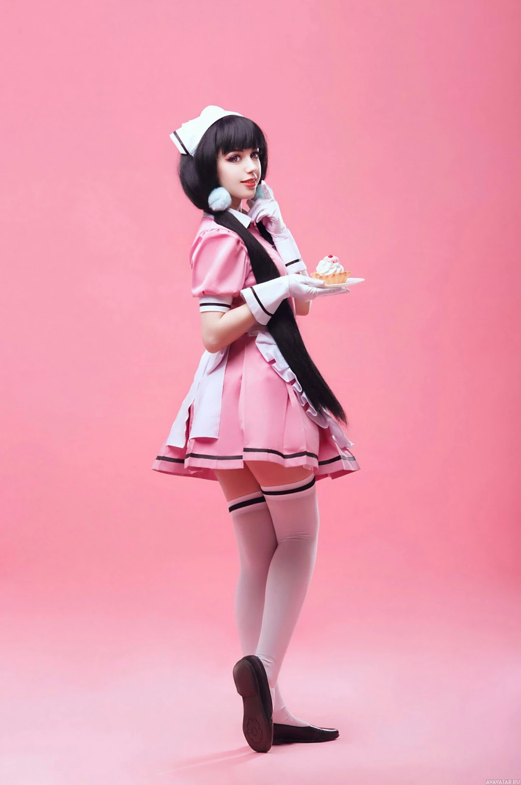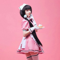 In the picture, there is a young woman dressed in a pink maid outfit. She has dark hair and is wearing white gloves. She is holding a small plate or tray with what appears to be a small cake or dessert on it. The background is solid pink, providing a contrast that highlights the subject.