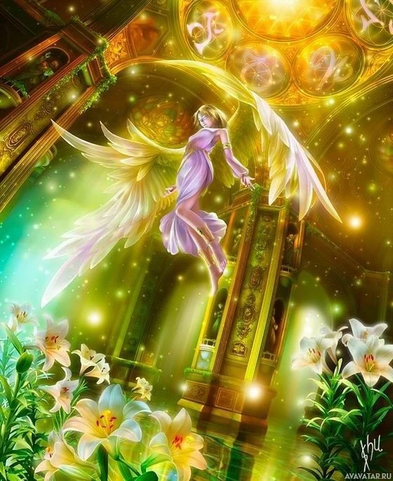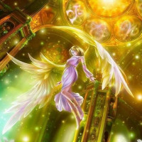 an angelic figure with wings who appears to be either floating or descending through an ornate archway, which seems to be made of a glowing material. The archway is adorned with stained glass-like panels that depict faces or figures in a mystical and ethereal style. Surrounding the figure are green