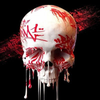 The image depicts a human skull with various graffiti or markings on it. There are red lines that resemble dripping blood, and white or grey-colored marks that could be interpreted as spray paint stencils, often associated with graffiti art. The background has a black texture that might suggest a hard surface like concrete.