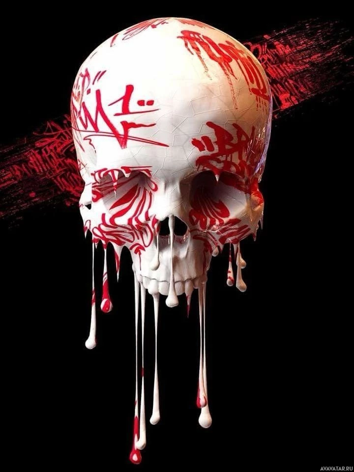 На картинке изображен человеческий череп с различными граффити или отметинами на нем. Есть красные линии, которые напоминают капающую кровь, и белые или серые отметины, которые можно интерпретировать как трафареты с краской, часто связанные с граффити. Фон имеет черную текстуру, которая может указывать на твердую поверхность, такую как бетон.