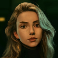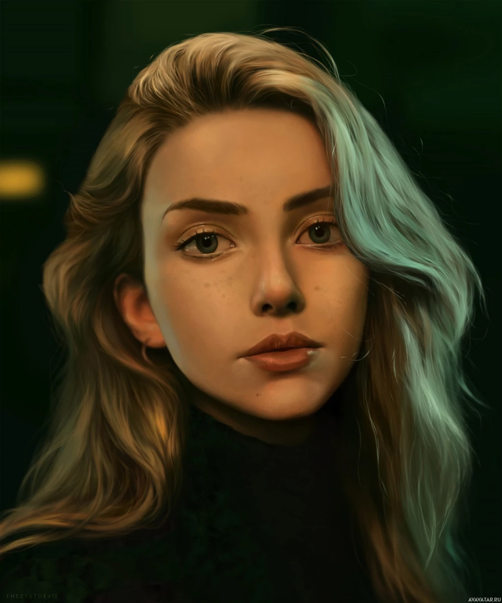 На картинке изображена молодая женщина со светлой кожей и светлыми волосами. Она, кажется, в помещении, возможно, в тускло освещенном пространстве, учитывая темный фон. Ее взгляд направлен на зрителя, и на лице у нее нейтральное выражение.