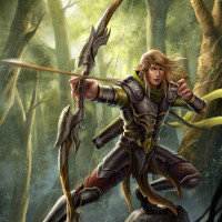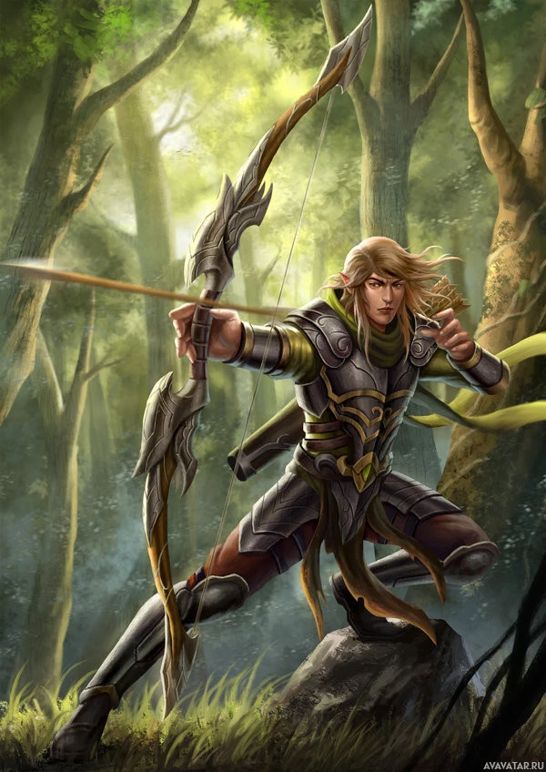 a fantasy character who appears to be an elf archer. The elf is depicted with pointed ears and