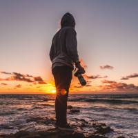 a hooded jacket and seem to be holding a camera or other equipment in their hands. The setting gives off a tranquil atmosphere, possibly suggesting they are there to capture photographs of the sunset or engage in some sort of