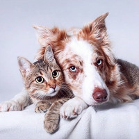 The image shows a cat and a dog resting together with their heads close to each other. The cat is on the left side of the frame, while the dog is on the right. They appear to be sharing a comfortable space and are in close