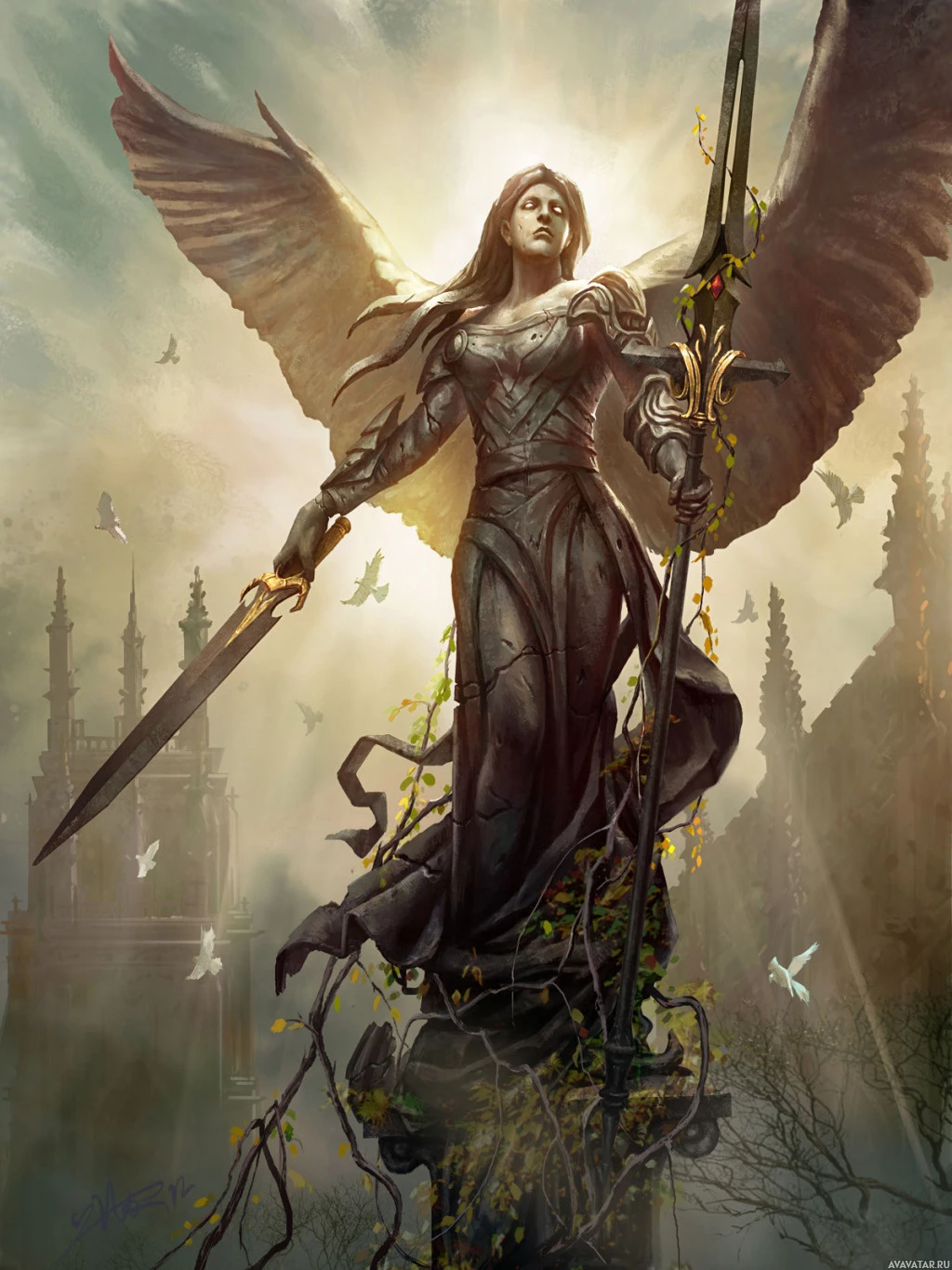 an angelic figure holding a sword. She is standing on what appears to be a statue or ruins, with a castle or church in the background, possibly suggesting a scene from a historical or mythical setting. There are elements such as wings and light shining downward, which contribute to her divine or celestial appearance.