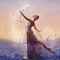 The image depicts a figure that appears to be a woman, who could possibly be blonde based on the hair color. She is in an ethereal or magical pose, with one arm reaching upwards as if she is casting something into the air or communicating with someone not visible in the picture. Her attire has a fantastical, flowing design, suggesting a scene that might be from a storybook or a work of