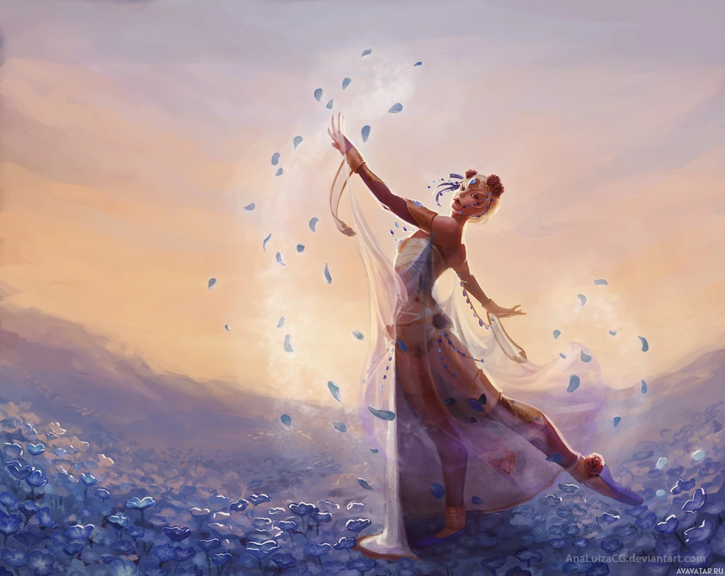 a soft glow and blue flowers scattered around her, adding to the serene and magical atmosphere of the image.