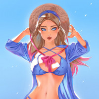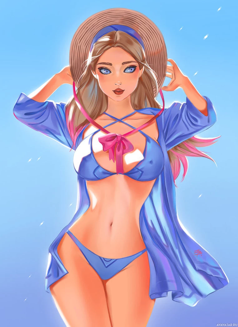 blue tones and a matching top, complemented by a wide-brimmed hat adorned with a pink ribbon on the side. Her right hand is holding her hat while her left hand is placed over her