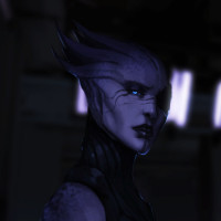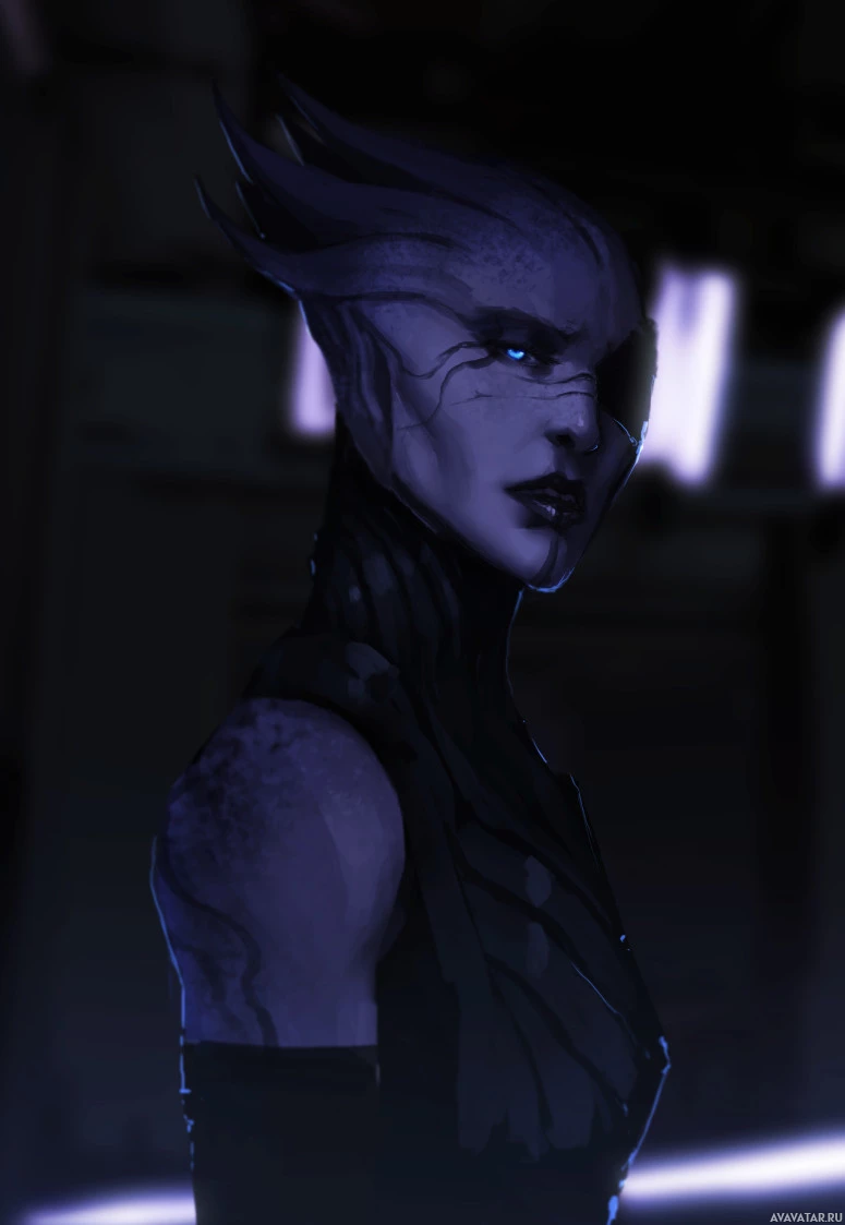 pointed ears and blue skin, which are typical for characters known as Asari, who are known for their advanced biotic abilities and often serve as protagonists or key figures throughout the series.