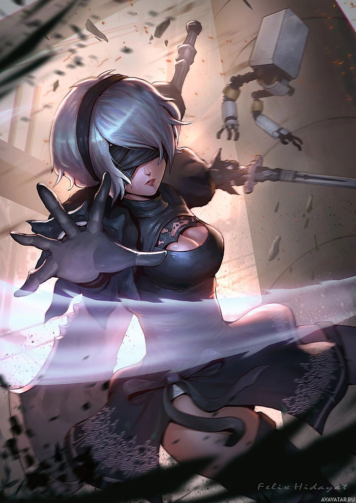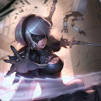 Изображение содержит иллюстрацию женского персонажа, известного как YoRHa No.2 Type B из видеоигры «Nier: Automata». Она изображена со светлыми волосами, в доспехах и с оружием на фоне, который предполагает битву или хаос.