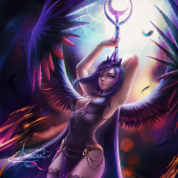 an illustrated character that appears to be an angel, with purple hair and fantasy-style attire. She is holding