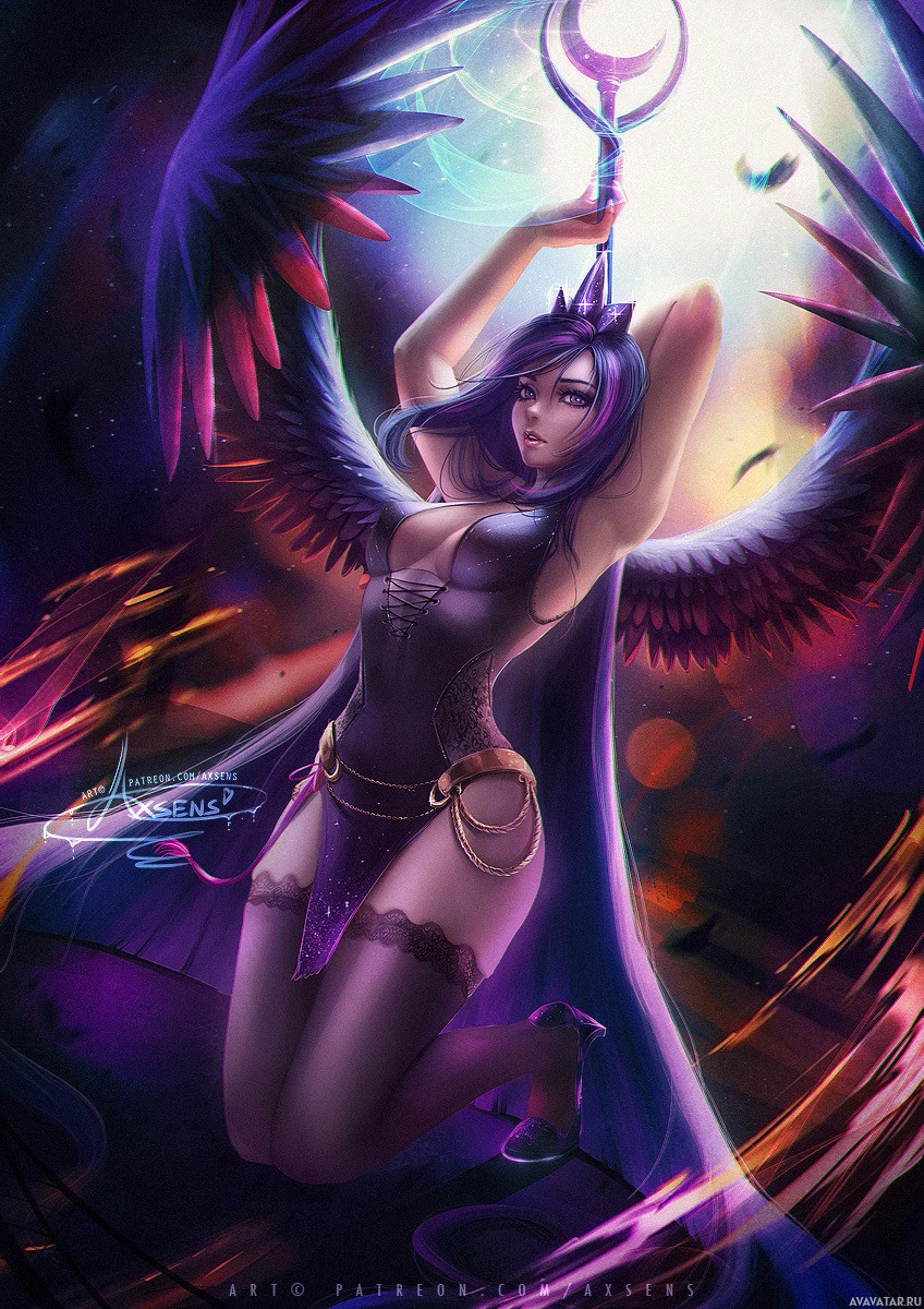 a crescent moon or horns atop her head, which adds to the mystical theme of the artwork. The character is shown in