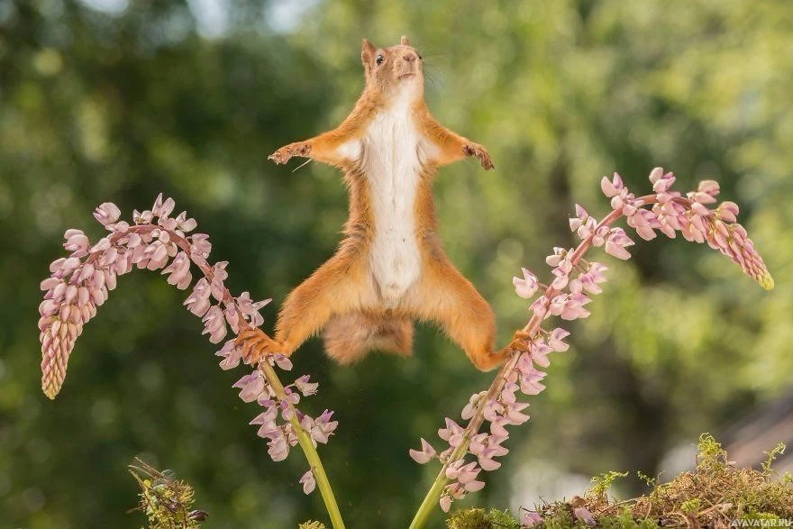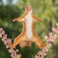 The picture shows a squirrel jumping with its paws outstretched and its tail raised. It appears to be mid-jump, giving the impression of being in motion. The squirrel is surrounded by plants that have small