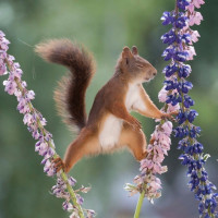 face close to some flowers, possibly purple in color. It's a cute image capturing a moment of a small mammal navigating
