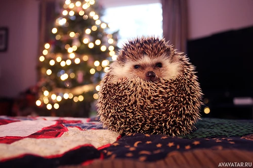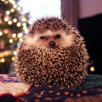 a Christmas tree in the background. The hedgehog has its arms tucked under its belly and is facing slightly towards the left side of the frame. It seems to be indoors, possibly during