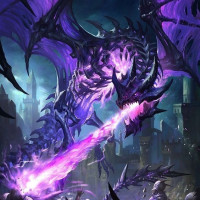 purple energy or flame towards some sort of magical barrier or shield. In the background, there are several human figures, possibly knights or soldiers, engaged in combat against a backdrop that could be a castle or ruins, suggesting
