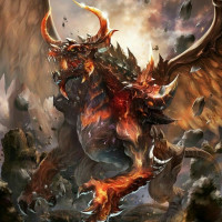 a fantasy creature, often referred to as a dragon. It has wings and horns, with a fiery appearance, suggesting it may have