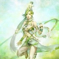 intricate designs, and her pose suggests she might be in motion or in action. The background has an ethereal quality, possibly indicating that this character is from